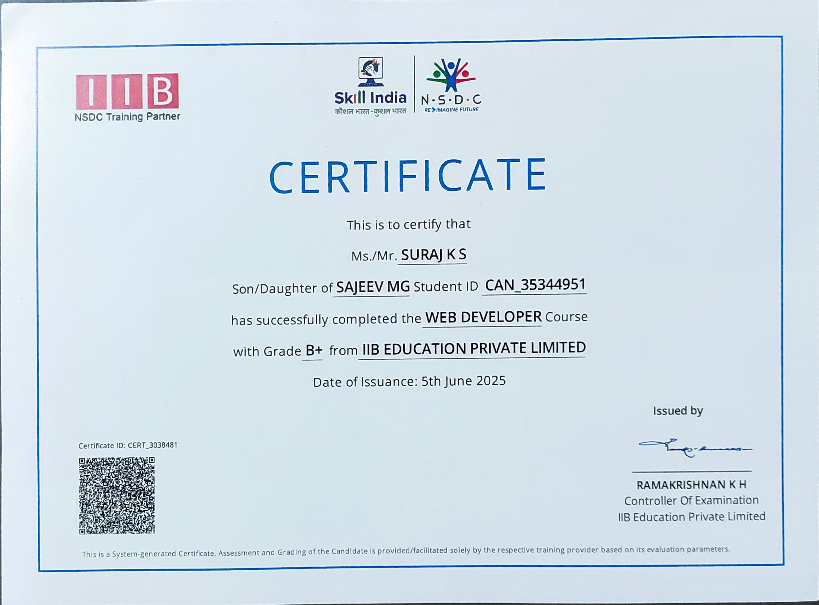 Certified Web Developer program by IIB Education and NSDC, focusing on professional industry standards and practices.
